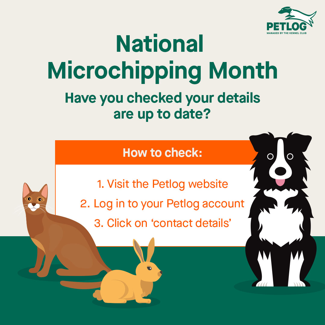 National Microchipping Month run by us and The Kennel Club takes place every June and aims to raise awareness of the importance of keeping your pet's details up to date so should the worst happen your pet can be reunited with you. It is also there to help show greater awareness of how important microchipping your pet can be.